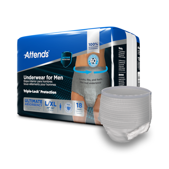 Attends Discreet Underwear se porte sous des vêtements comme des sous-vêtements ordinaires, ils offrent une alternative aux slips pour les personnes plus actives. Ce produit haut de gamme est conçu avec un tissu doux et respirant semblable à un tissu et une taille élastique sur tout le ventre pour un ajustement confortable et profilé. Les matériaux de base avancés ont une capacité d'hydratation élevée, canalisant le fluide et le bloquant pour garder la peau sèche et saine. Avec la protection supplémentaire des poignets de barrière, les sous-vêtements discrets Attends sont recommandés pour l'incontinence modérée à sévère. Les panneaux latéraux détachables rendent le retrait rapide et facile.