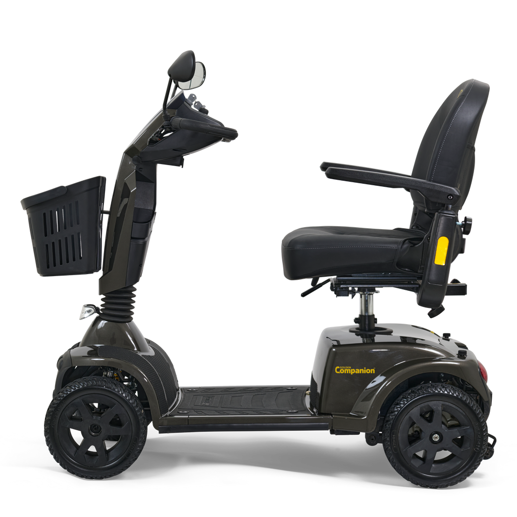 Golden’s popular Companion 4-wheel scooter has a sporty new look and upgraded comfort features! This next-generation model has a well-designed, wider infinite adjustable tiller with a digital dashboard featuring a percentage battery life indicator and water-resistant buttons on the control panel, plus two convenient cup holders. It offers the most leg and foot room in its class with a modern, rugged design and full front and rear suspension for a smooth ride.