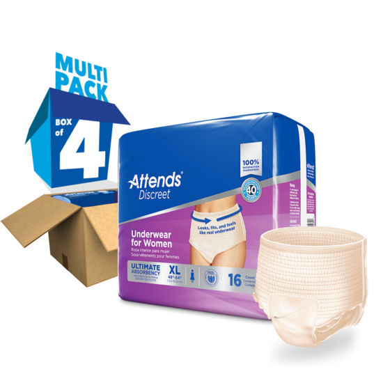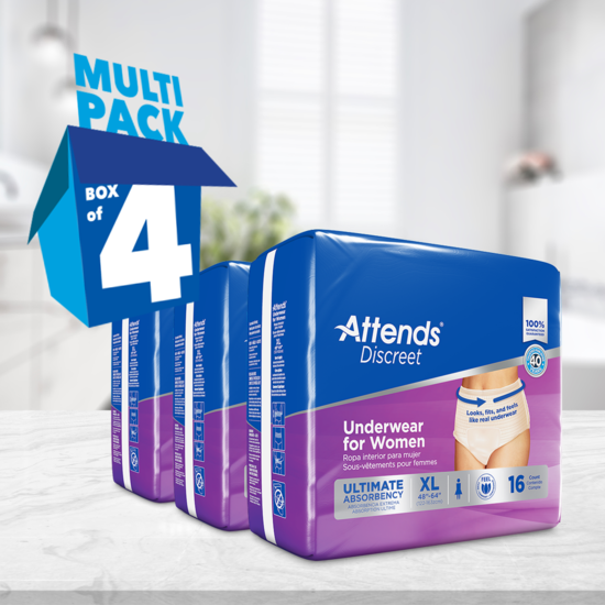 Attends Discreet Underwear is worn under clothing like regular underwear, they provide an alternative to briefs for more active individuals. This premium product is designed with a soft, cloth-like breathable fabric and full-belly elastic waistband for a comfortable, contoured fit. The advanced core materials have a high moisture capacity, channeling fluid and locking it away to keep the skin dry and healthy. With the added protection of barrier leg cuffs, Attends Discreet Underwear is recommended for moderate to heavy incontinence. Tear-away side panels make removal fast and easy.