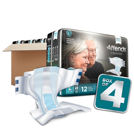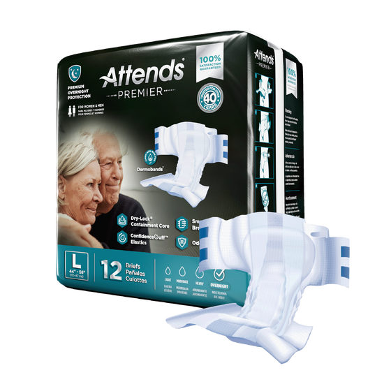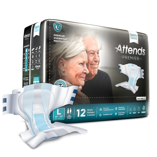 The Attends Premier Briefs were designed to help you or those you care for manage heavy to severe urinary and/or fecal incontinence. Because Attends uses some of the softest and most absorbent materials available, Attends Premier will help you feel confident that you or your loved ones are protected during the day or overnight. The high-rise, full-fit protection and breathable, soft side panels results in a product that fits comfortably and securely in all the right areas. So go on the trip, walk on the beach, have dinner with your friends and family, don’t let a leak stop you from being with the ones you love. Trust in Attends Premier to protect you during the moments that matter most.