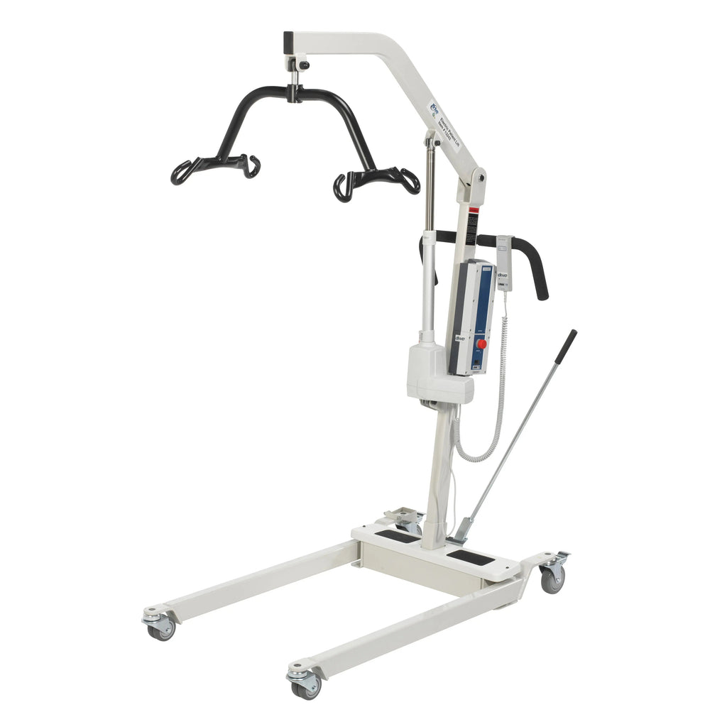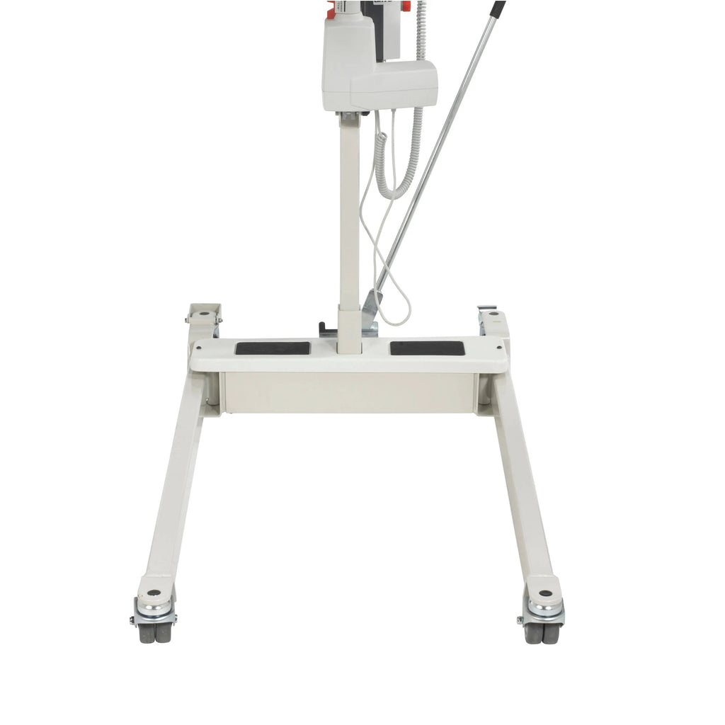 With a 600 pound weight capacity, this bariatric battery-powered lift with rechargeable battery by Drive Medical has strength on its side. The extra wide, coated cradle rotates 360 degrees and includes 4-point hook up. A high lift range allows the unit to transfer patients to high surfaces. The battery can be charged by plugging in the unit, and never needs to be removed (The lift will not operate while plugged in). A jumbo actuator pump that lowers the patient ensures safe repositioning. The pump even includes an emergency button and can be switched to manual mode. Sturdy base legs - with dual, 3" heavy duty front casters - adjust easily and lock securely into open position with padded shifter handles.