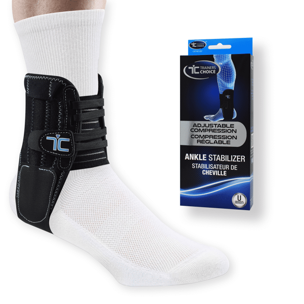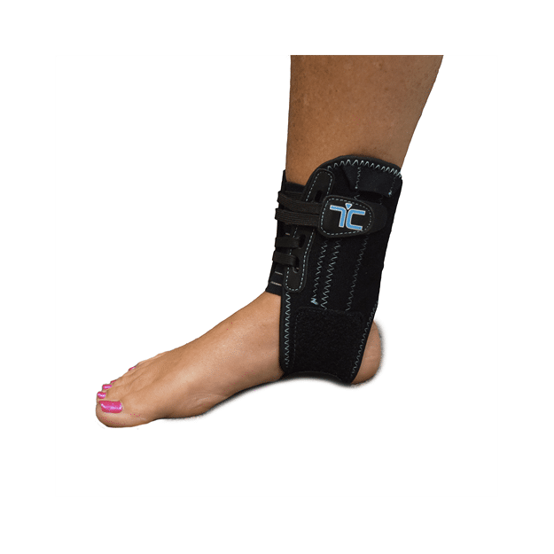 Features adjustable compression support with bilateral rigid side stabilizers and easy pull lacing.