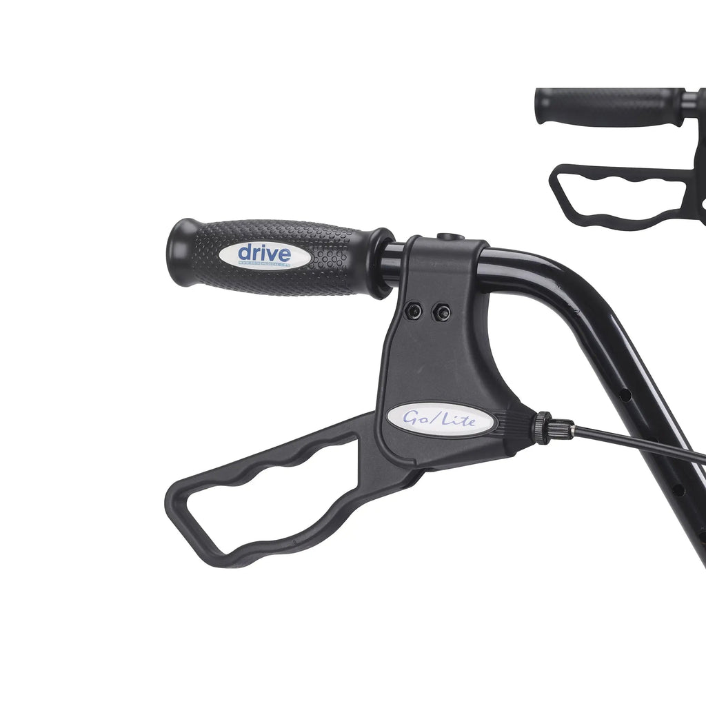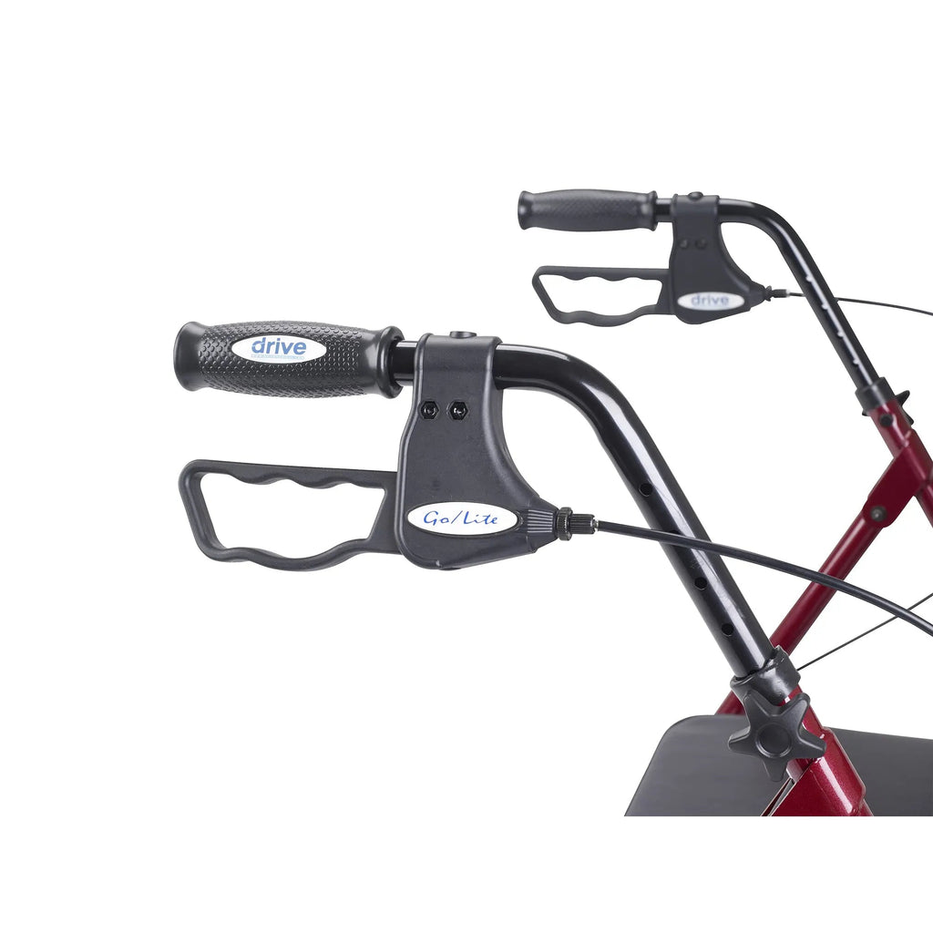 The Go-Lite Bariatric Rollator by Drive Medical comes in an attractive red or blue finish. It is constructed from a strong, steel reinforced frame that supports 500 pounds and comes standard with a large, comfortable, soft padded, oversized seat with a large basket that is mounted underneath. The basket easily and securely transports personal items. The large, 8" caster wheels are ideal for indoor and outdoor use ensuring a smooth ride over most surfaces.