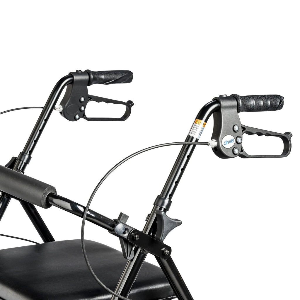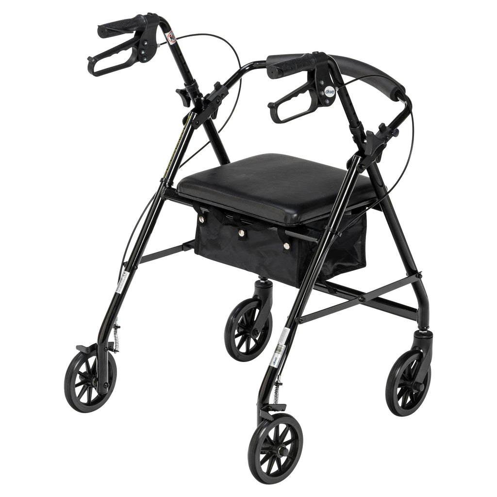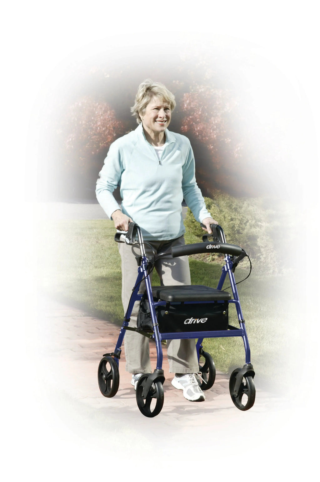 The Walker Rollator with 6" Wheels, Fold Up Removable Back Support and Padded Seat by Drive Medical comes standard with 6" caster wheels, loop locks and serrated brakes to ensure safety. The seamless padded seat opens to a roomy, convenient, zippered storage pouch to easily and securely transport personal items, and the ergonomic handles are easy to grip, relieve hand pressure, and are height adjustable to accommodate users height. This Rollator by Drive Medical is a great value that provides the freedom of mobility. With a convenient seat for resting and loop locks that keep the Rollator from moving, you can be assured that this mobility aid will provide a safe and secure way to regain your active lifestyle.